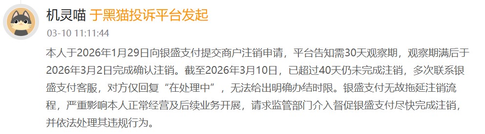 有效户反应被无故拖延刊出进程。该用户称向银盛支付提交商户刊出央求,平台奉告需30天不雅察期,但已进步40天仍未完成刊出,屡次琢磨银盛支付客服,对方无法给出明确办结时限。银盛支付无故拖延刊出进程,严重影响其宽泛遐想及后续业务开展。