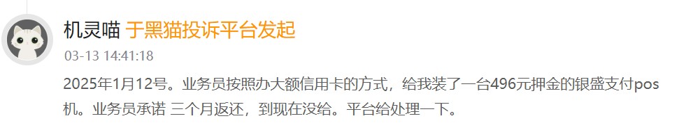 更有非常多用户反应pos机押金不退。有效户暗示,业务员按照办大额信用卡的神志给装了一台496元押金的银盛支付pos机,业务员答允三个月返还但迟迟未终了。