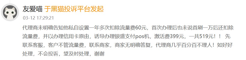 有效户反应被结合办理银盛支付pos机,一年屡次被扣除流量费。